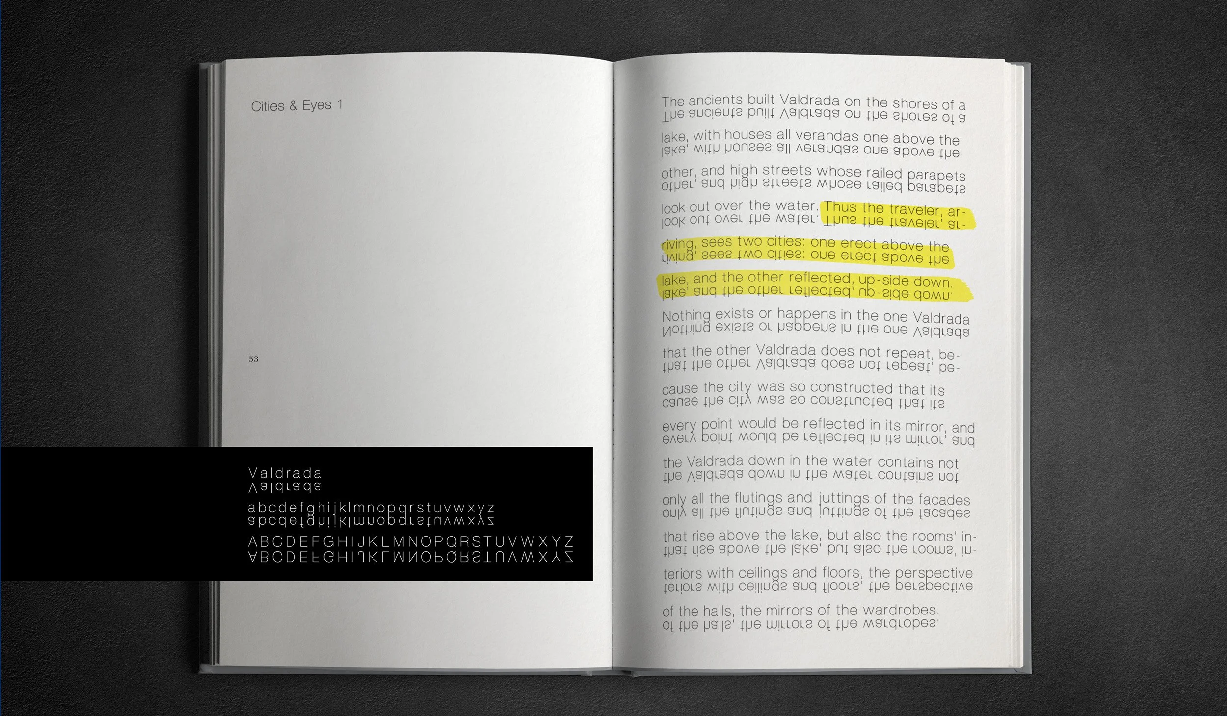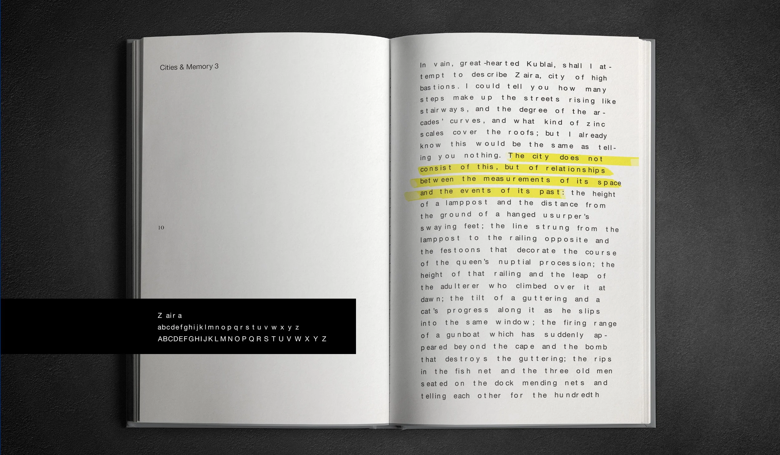 I transformed these imaginative city descriptions into a unique font system. Based on the Helvetica font, each font is meticulously customized to reflect the essence of a particular city. The result is a book showcasing 55 different fonts, each designed to visually encapsulate the atmosphere and structure of Calvino’s poetic cities.