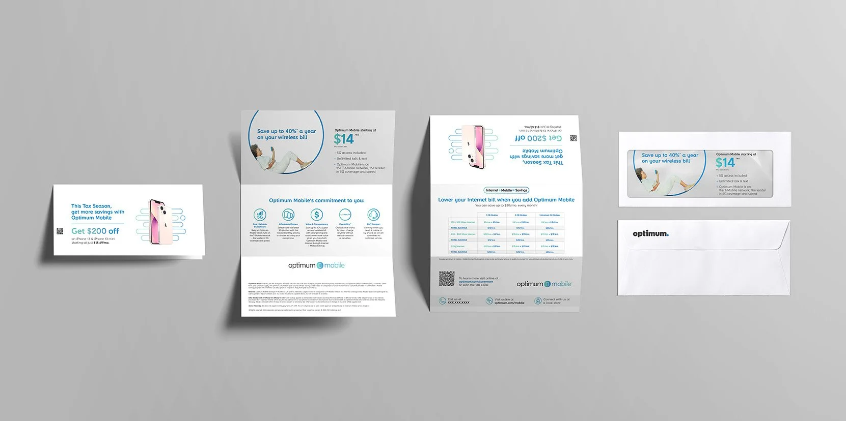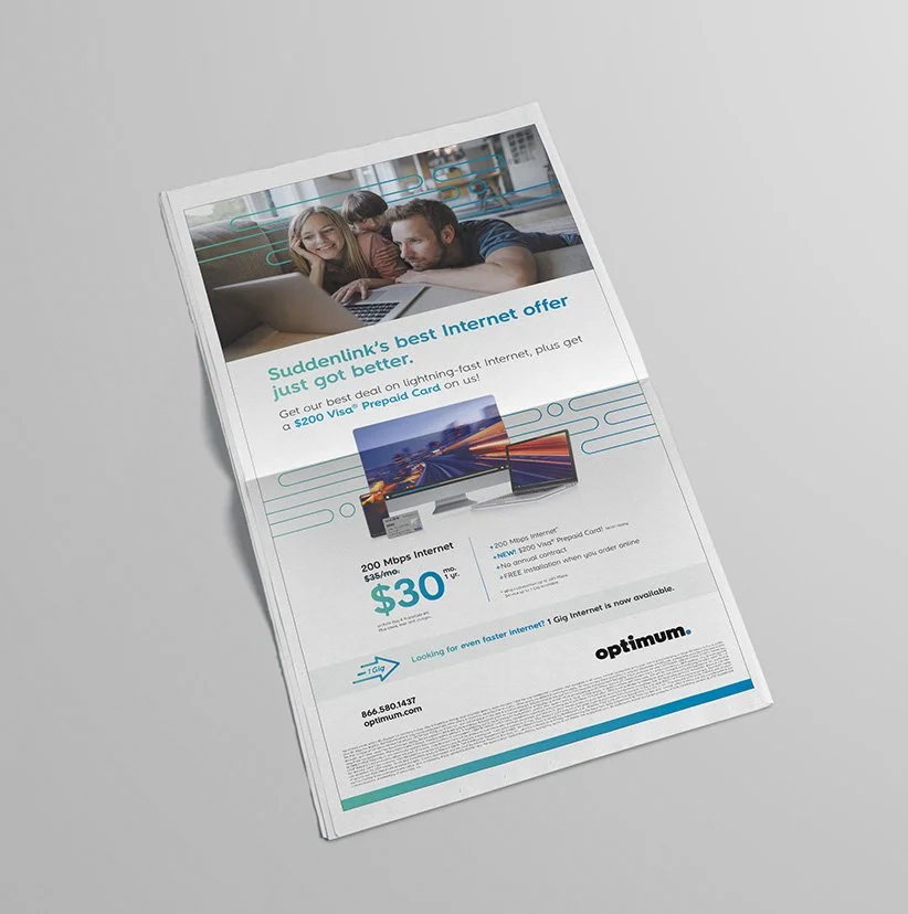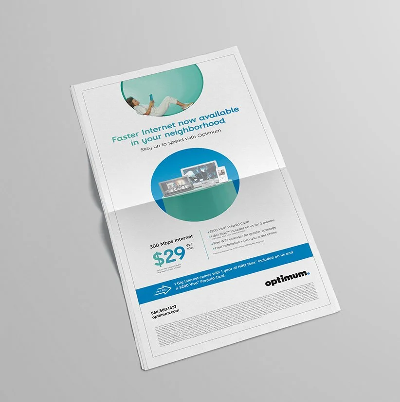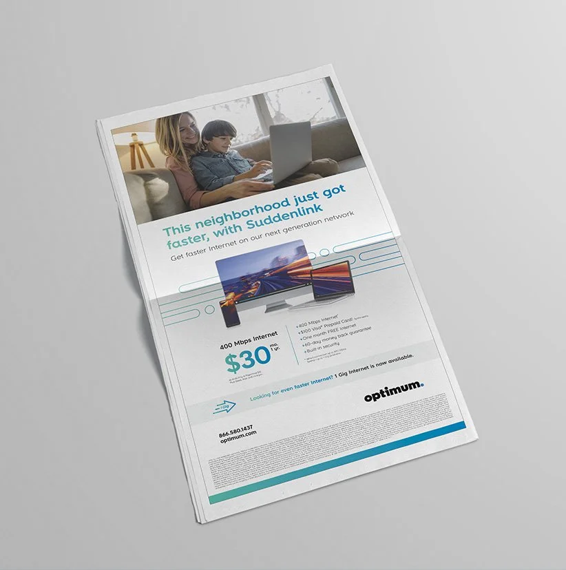 In reimagining Optimum and Optimum Mobile’s brand identity, we focused on the beam as a central visual metaphor and identity system. The beam embodies our brand essence, symbolizing technology and connection. It seamlessly integrates Optimum in the East, Suddenlink in the West, and Optimum Mobile, creating a cohesive and recognizable visual language.